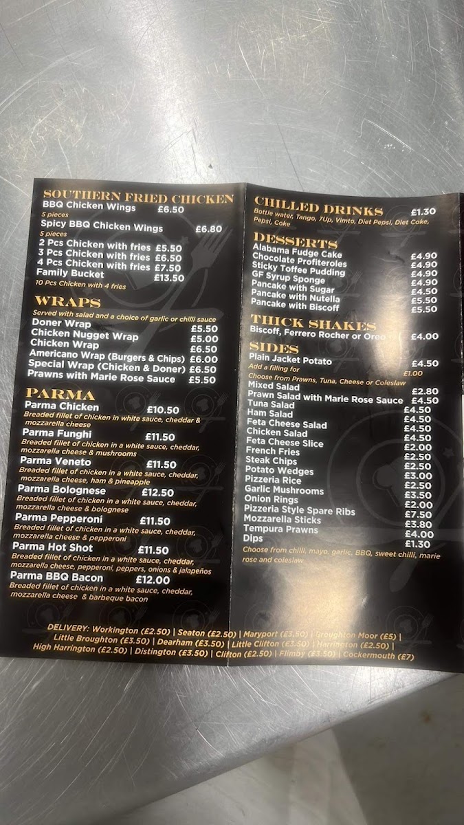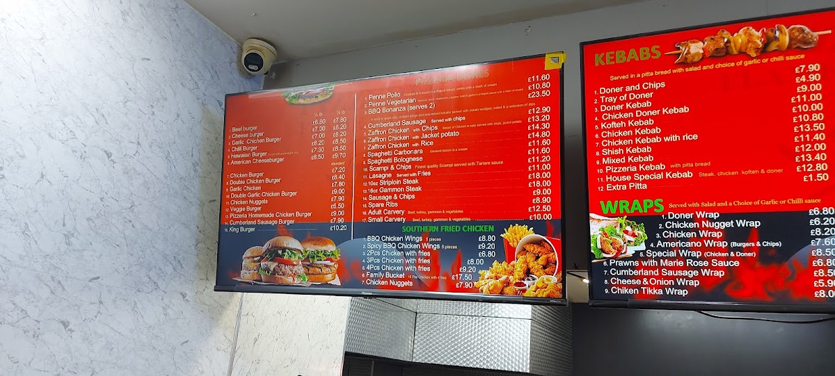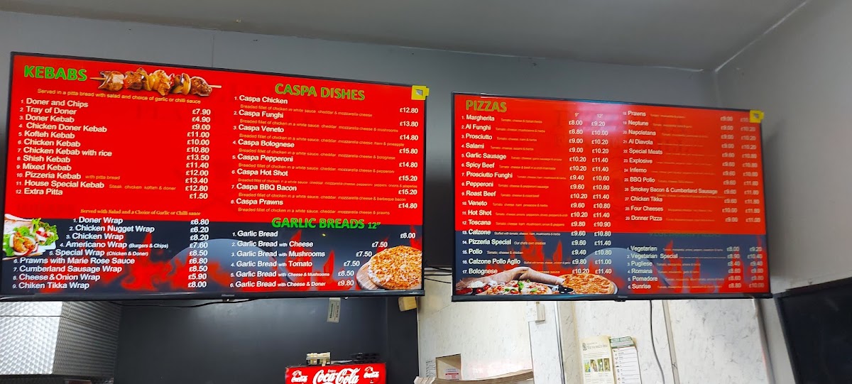 From a reviewer’s perspective, the menu at Pizzeria Flame Grill offers an impressively broad selection that caters to a wide range of tastes, even though prices are not listed. The Caspa section stands out with options like Caspa Chicken, Caspa Funghi, and Caspa Bolognese, while the wraps such as Donner Wrap, Chicken Wrap, and Cumberland Sausage Wrap provide quick, satisfying choices. Their pizza lineup is classic and reliable, featuring staples like 9" Margherita, 12" Al Funghi, and 9" Proscuitto, alongside vegetarian-friendly options like 9" Vegetarian Special and 9" Pugliese. The garlic breads, including 12" Garlic Bread With Cheese And Mushroom, make for excellent sides, while heartier dishes like Donner Kebab, Chicken Kebab, and burgers such as the Half Pounder Cheese Burger add to the variety. The Southern fried chicken range, including 5pcs BBQ Chicken Wings and 4pcs Of Chicken With Fries, is ideal for comfort food lovers. More substantial meals like 10ounce Strinioin Steaks and Salmon And Stake With Rice And Salad further elevate the menu. With lighter bites like Jacket Potato With Tuna Mayo, sides such as Mozzarella Sticks 4, indulgent desserts like Alabama Fudge Cake, and drinks including Pepsi Can, the menu feels complete and well-rounded, making it a versatile choice for different cravings.